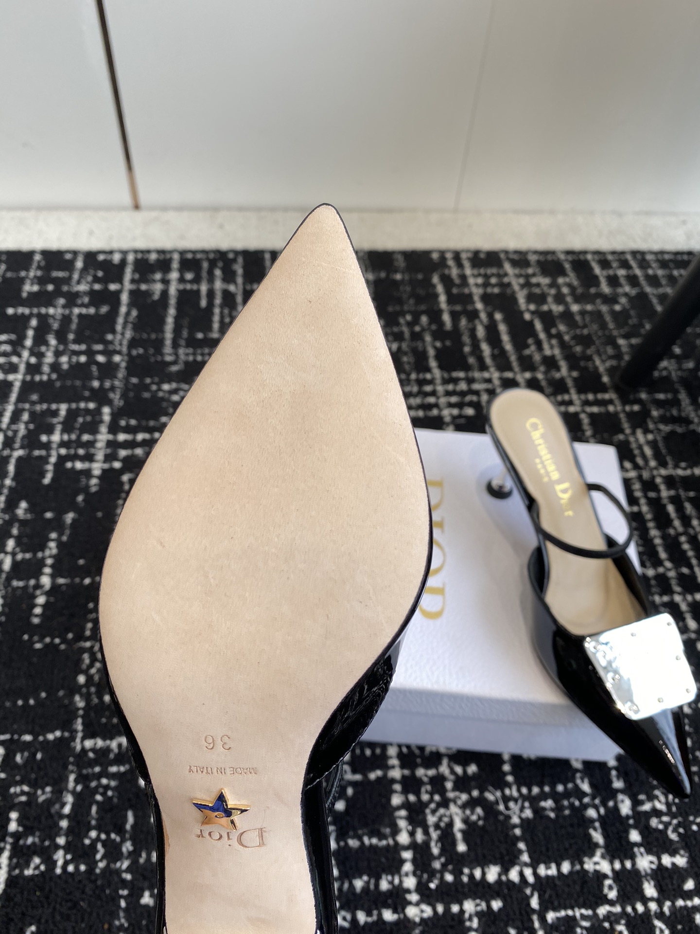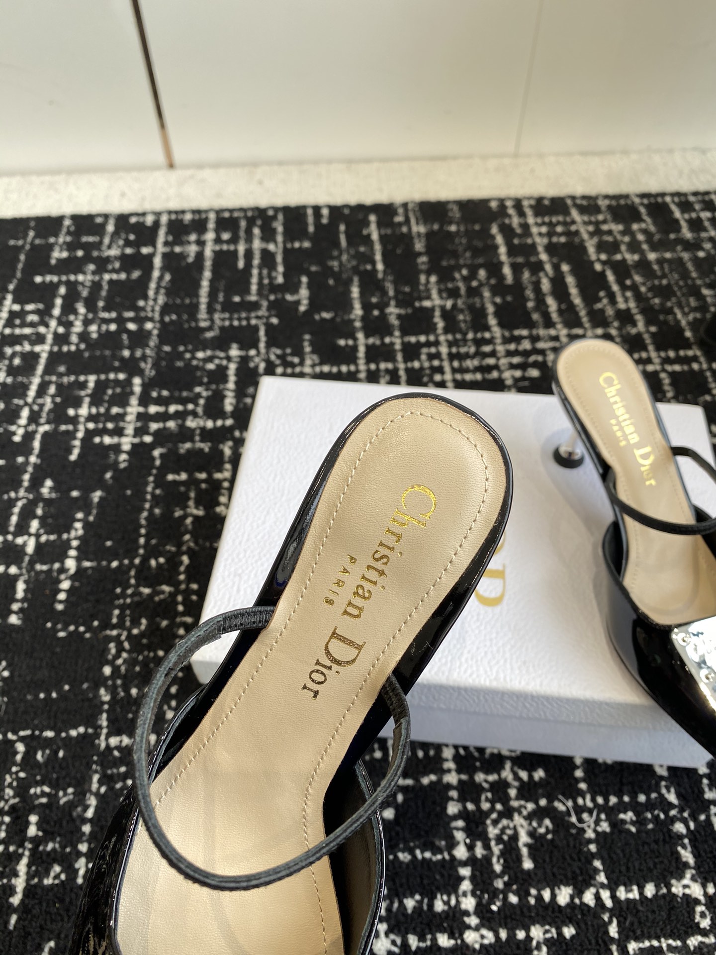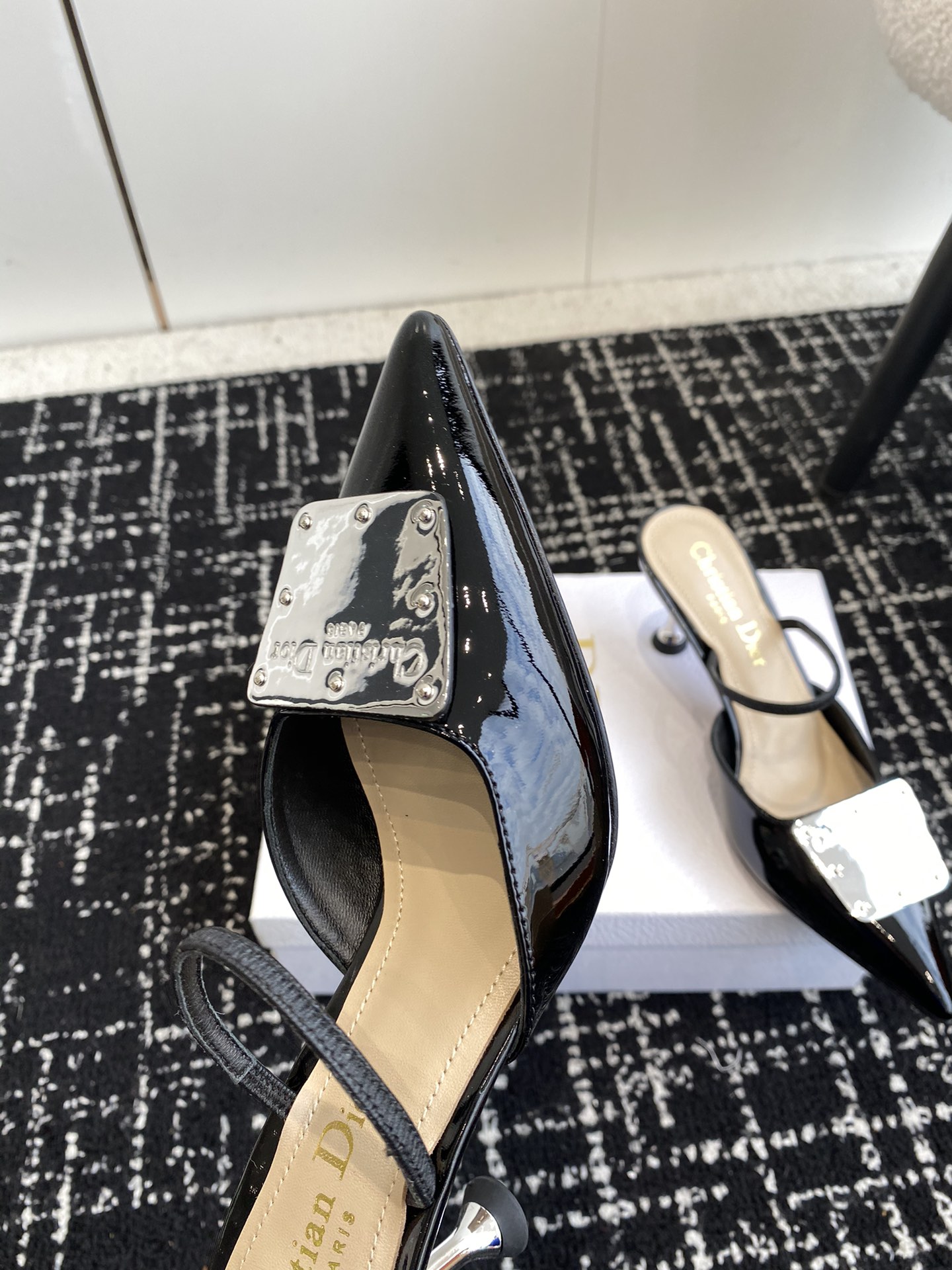 Patent cowhide leather upper paired with silver-toned cowhide leather metal plaque, creating a mirror effect and featuring the Christian Dior Paris logo.