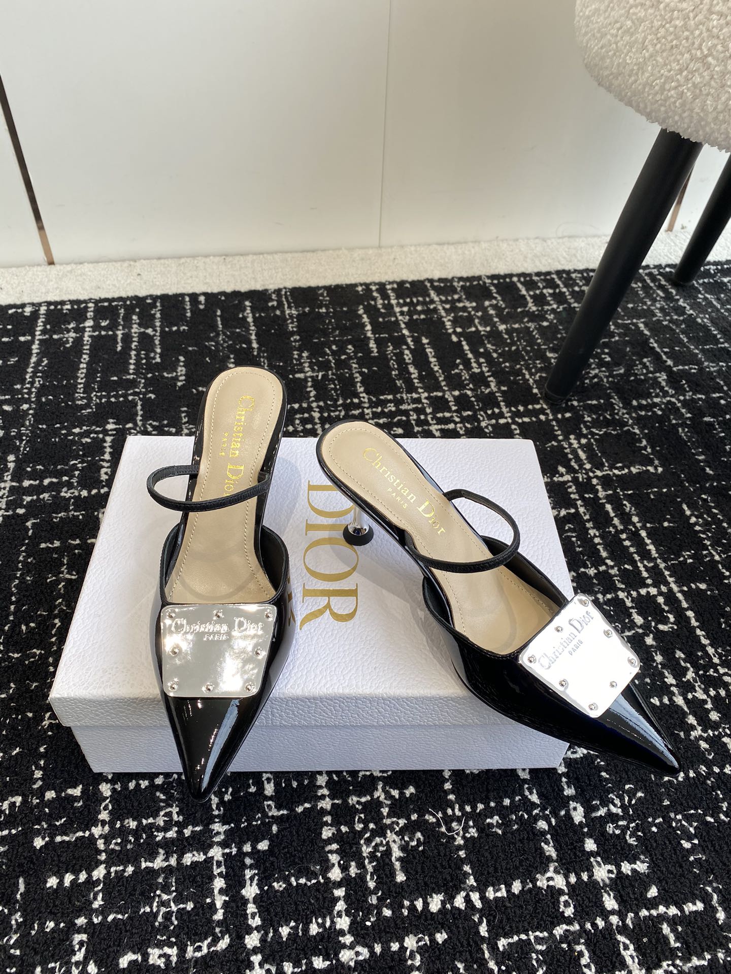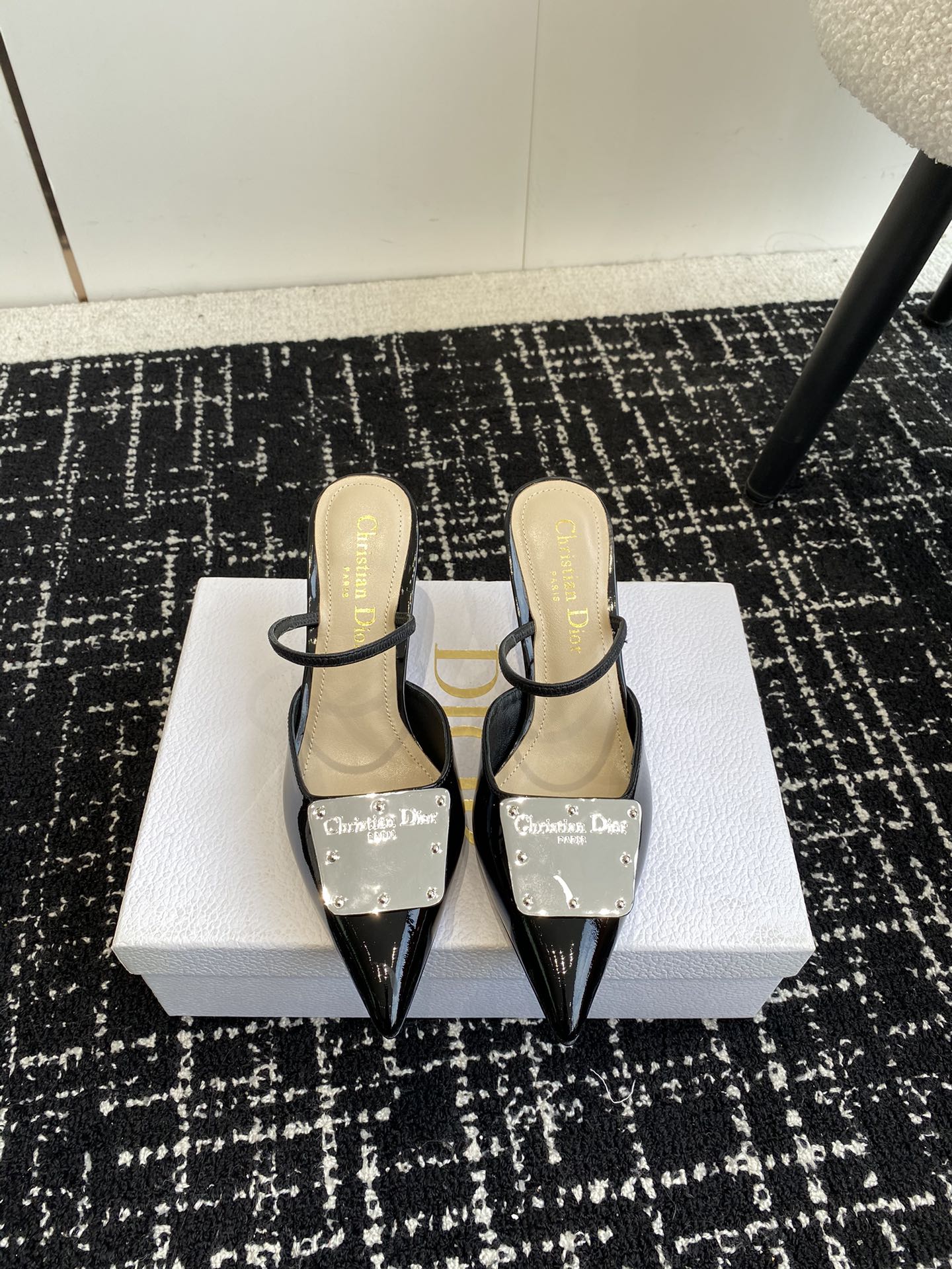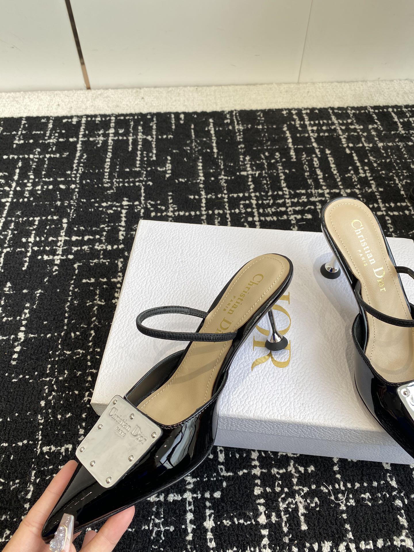 Patent cowhide leather upper paired with silver-toned cowhide leather metal plaque, creating a mirror effect and featuring the Christian Dior Paris logo.