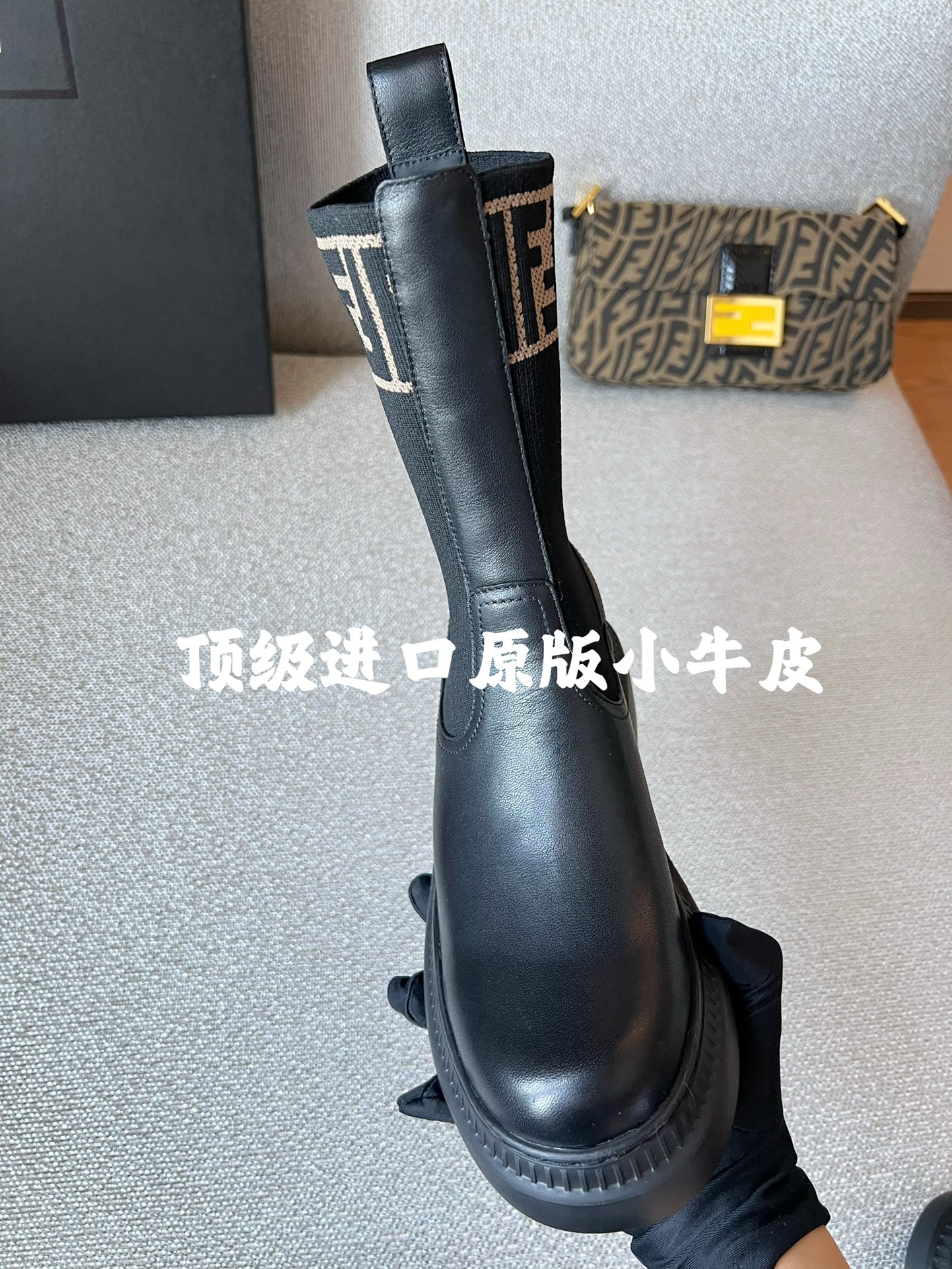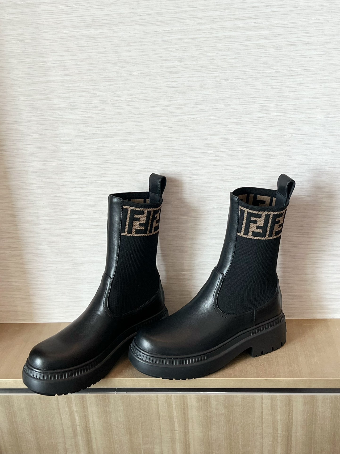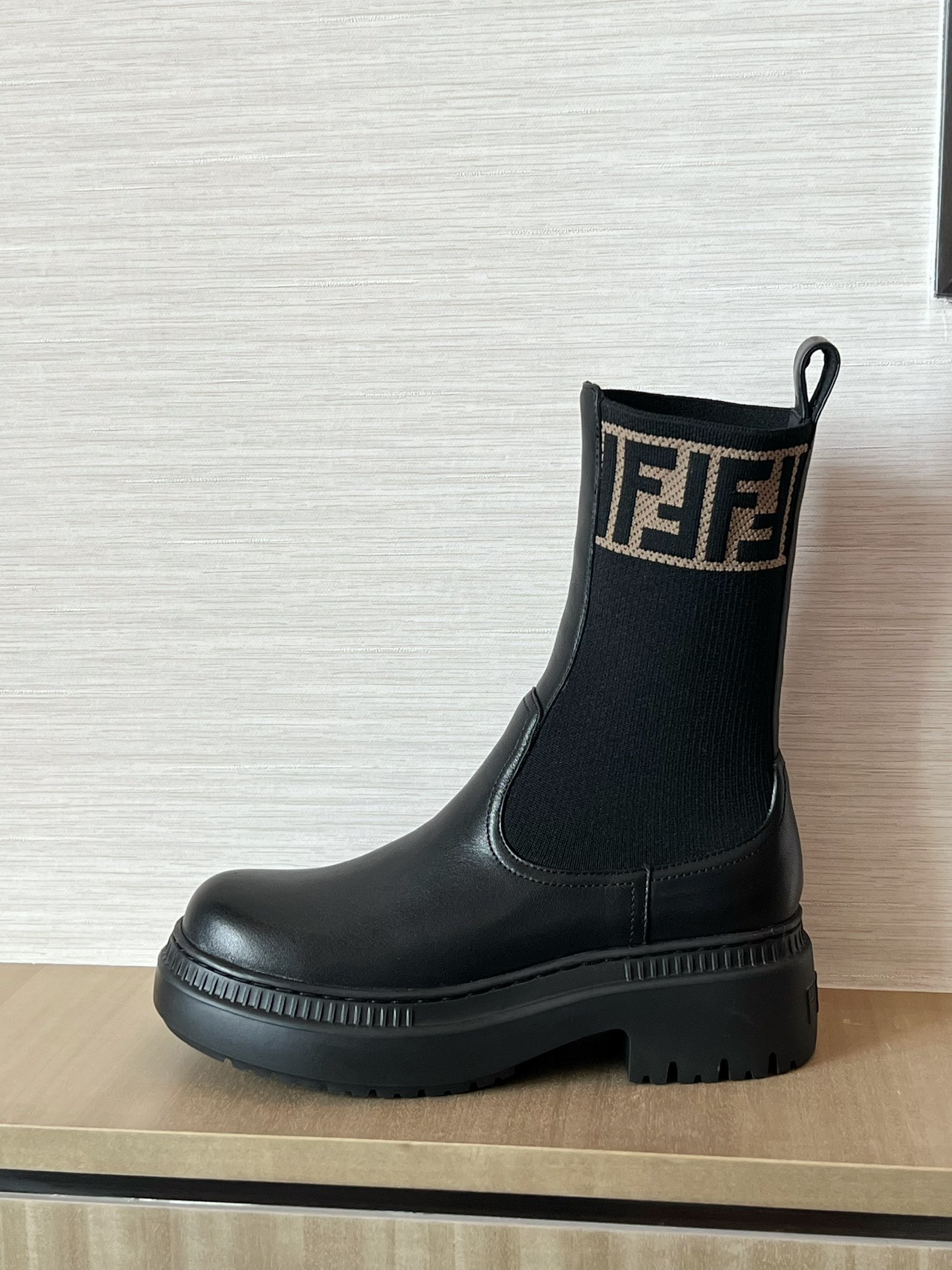 Material: Black imported genuine calf leather. FF logo woven on the shoe's side, round toe, elastic design on the sides. Original rubber textured outsole. Crafted with Italian handiwork!
