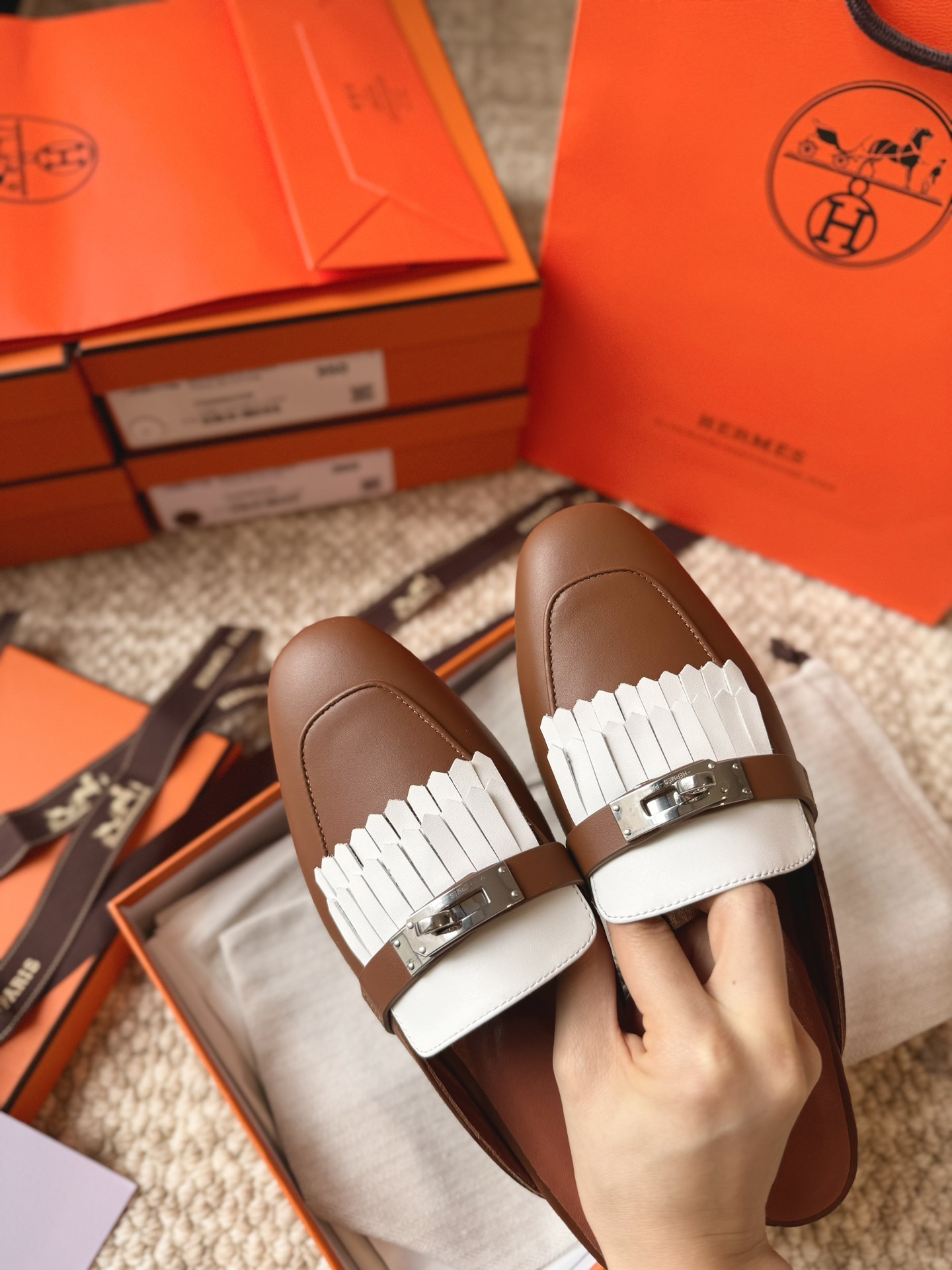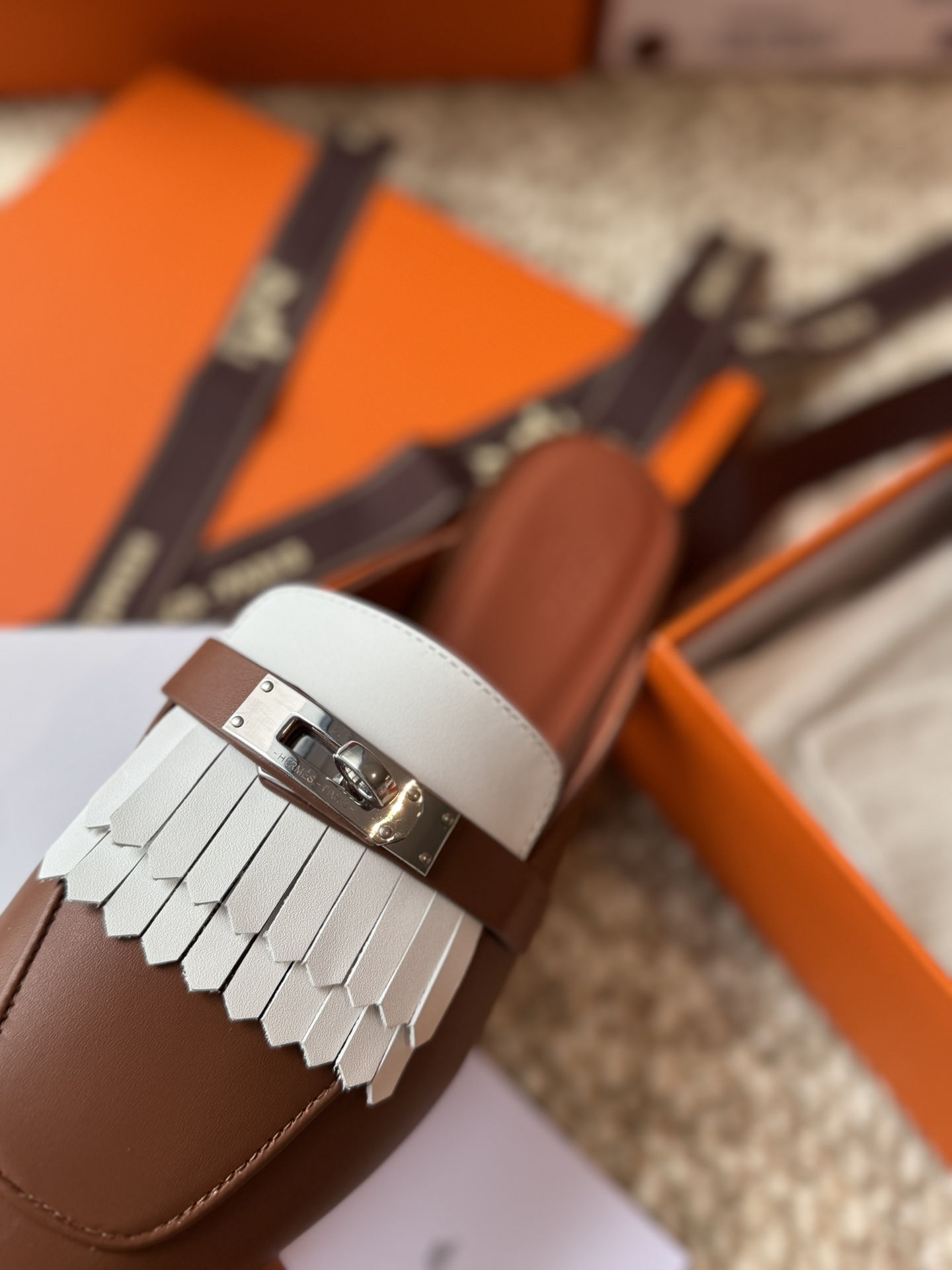 Hermes official website Oz calf leather fringe mules, original custom-made imported calf leather, imported mixed sheepskin lining, A-grade double-layered genuine leather outsole, through-dyed outsole won't fade, original coding, showcasing the unique craftsmanship in its original form.