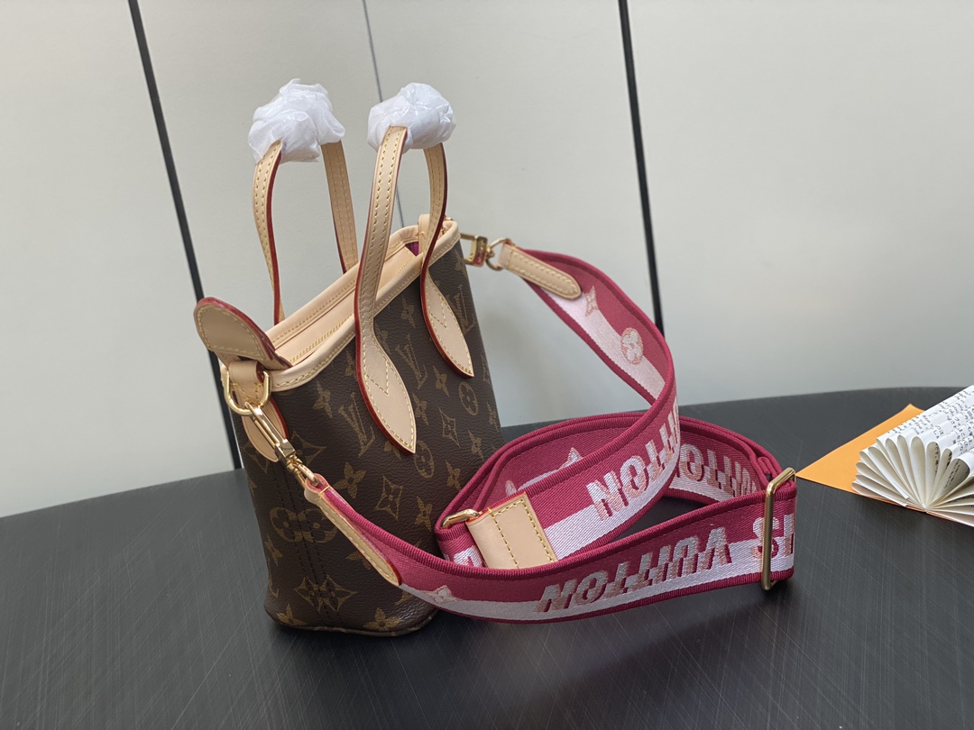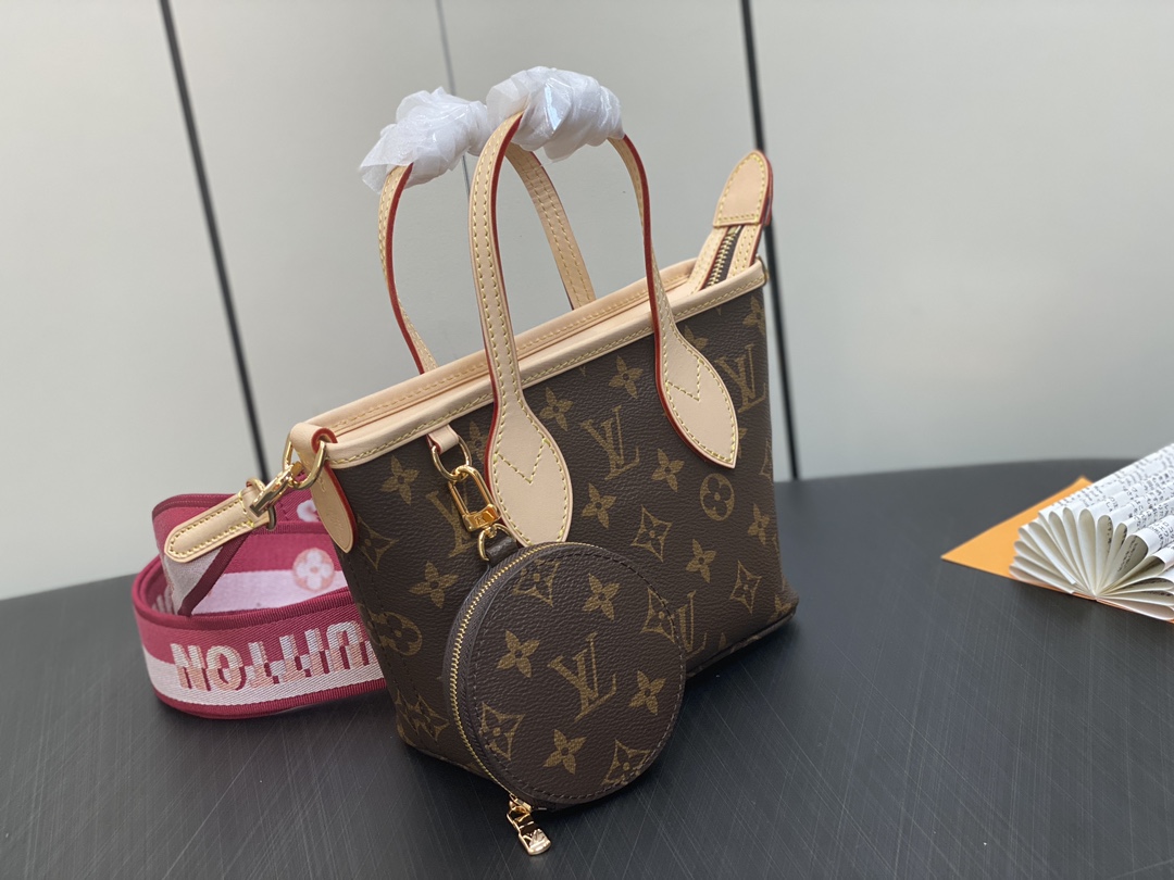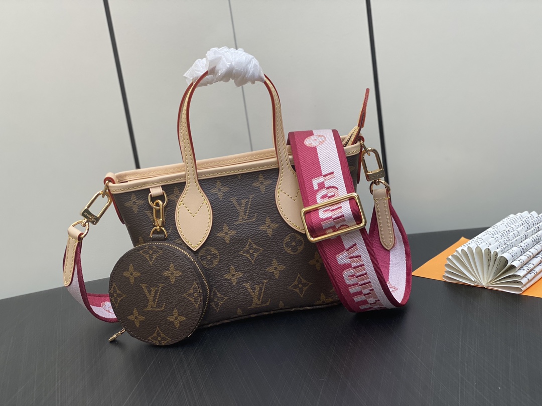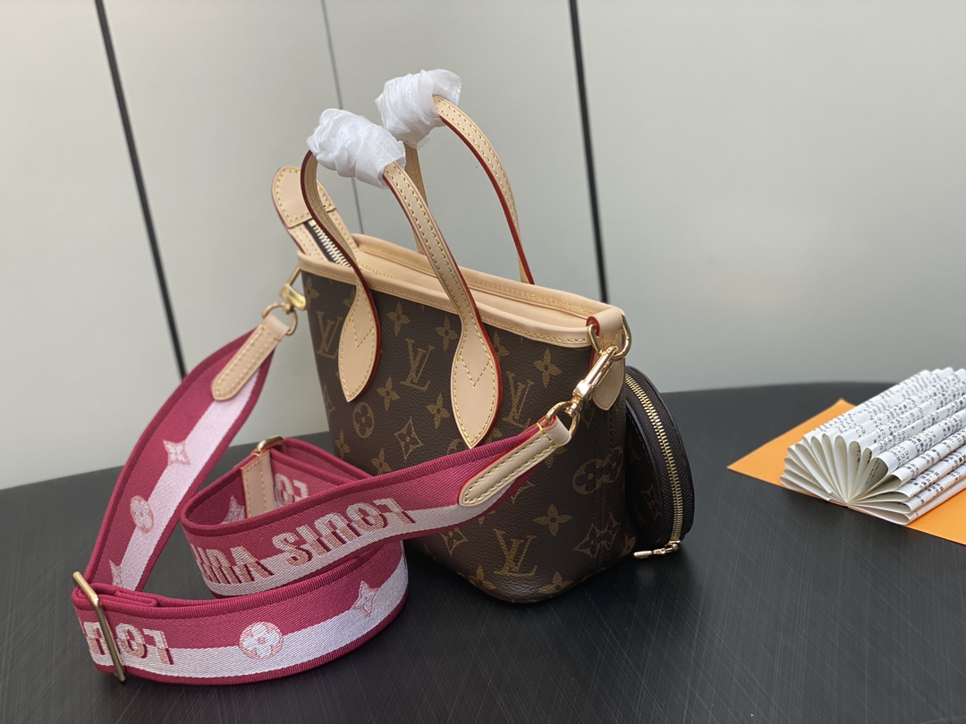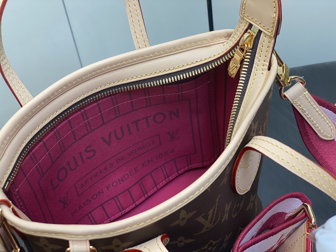 M46786 Plum Red Mini Shopping Bag Series Neverfull BB New Handbag The latest Neverfull BB handbag has added a zipper and comes with a brand new wide shoulder strap. It's versatile for everyday use, easily accommodating a phone and lipstick without any pressure. It also comes with a built-in coin purse. It can be carried by hand, worn over the shoulder, or slung diagonally. A timeless classic that never goes out of style!