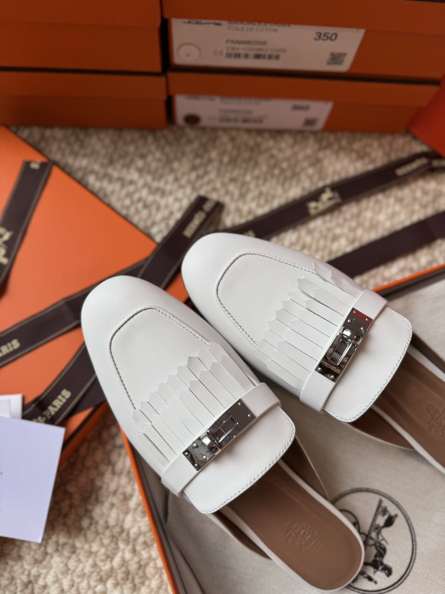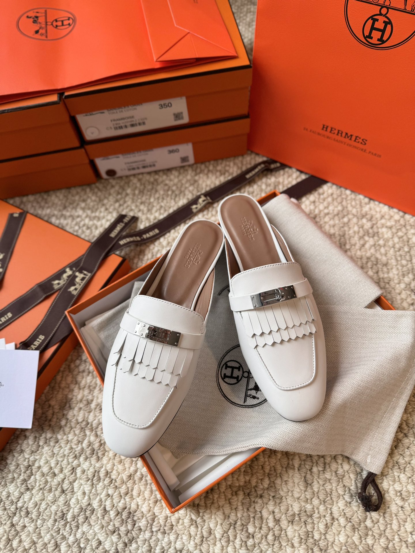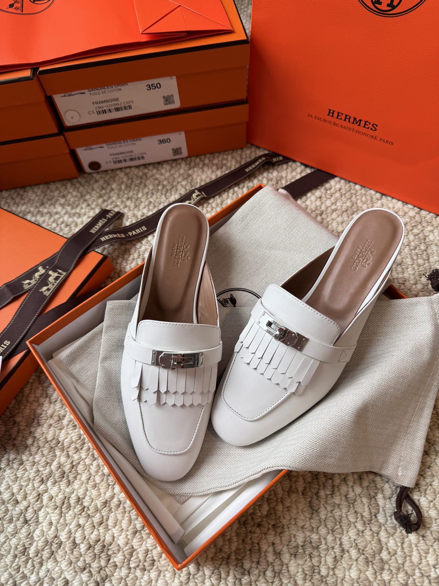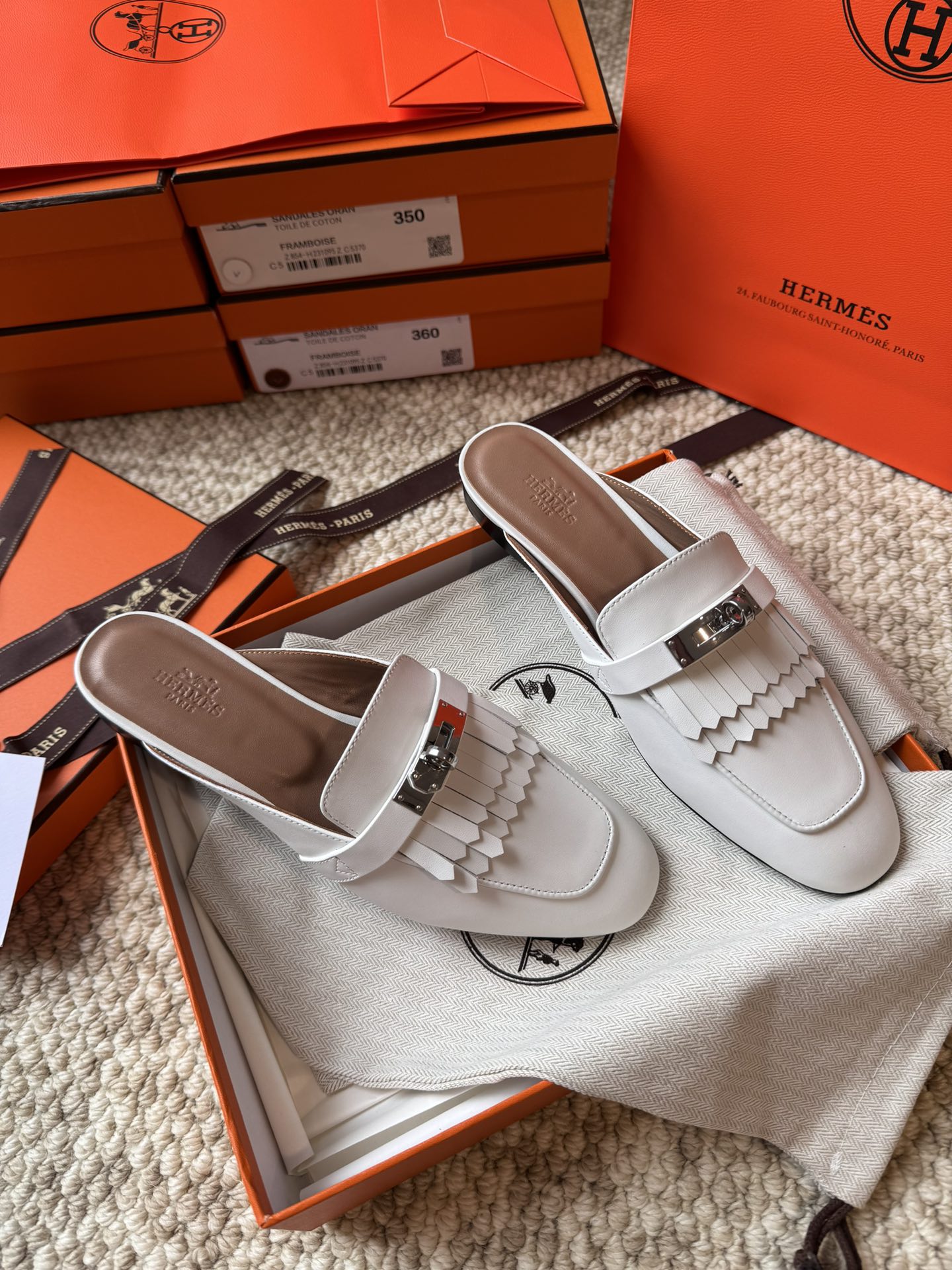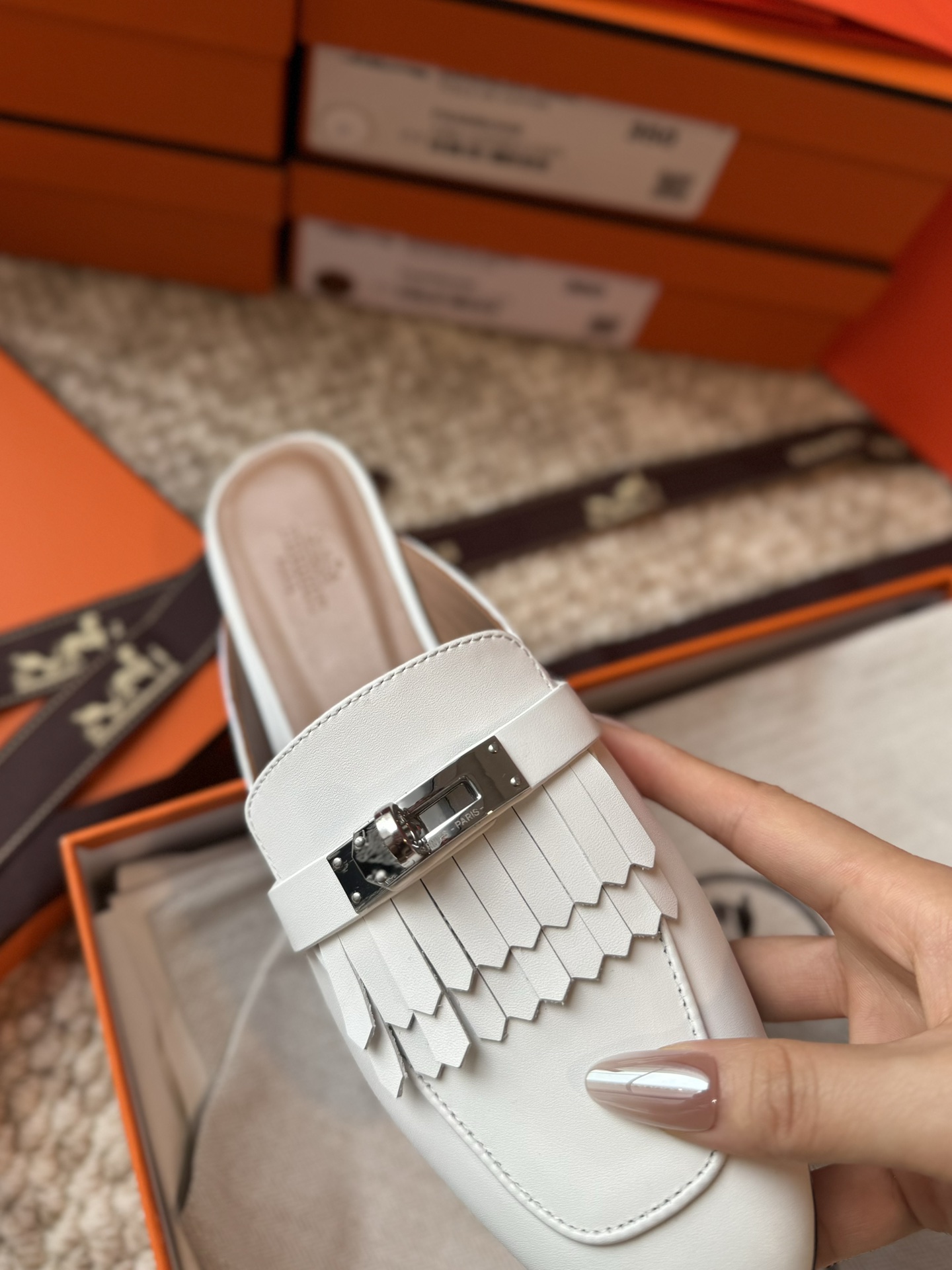 Hermes official website Oz calf leather fringe mules, original custom-made imported calf leather, imported mixed sheepskin lining, A-grade double-layered genuine leather outsole, through-dyed outsole won't fade, original coding, showcasing the unique craftsmanship in its original form.