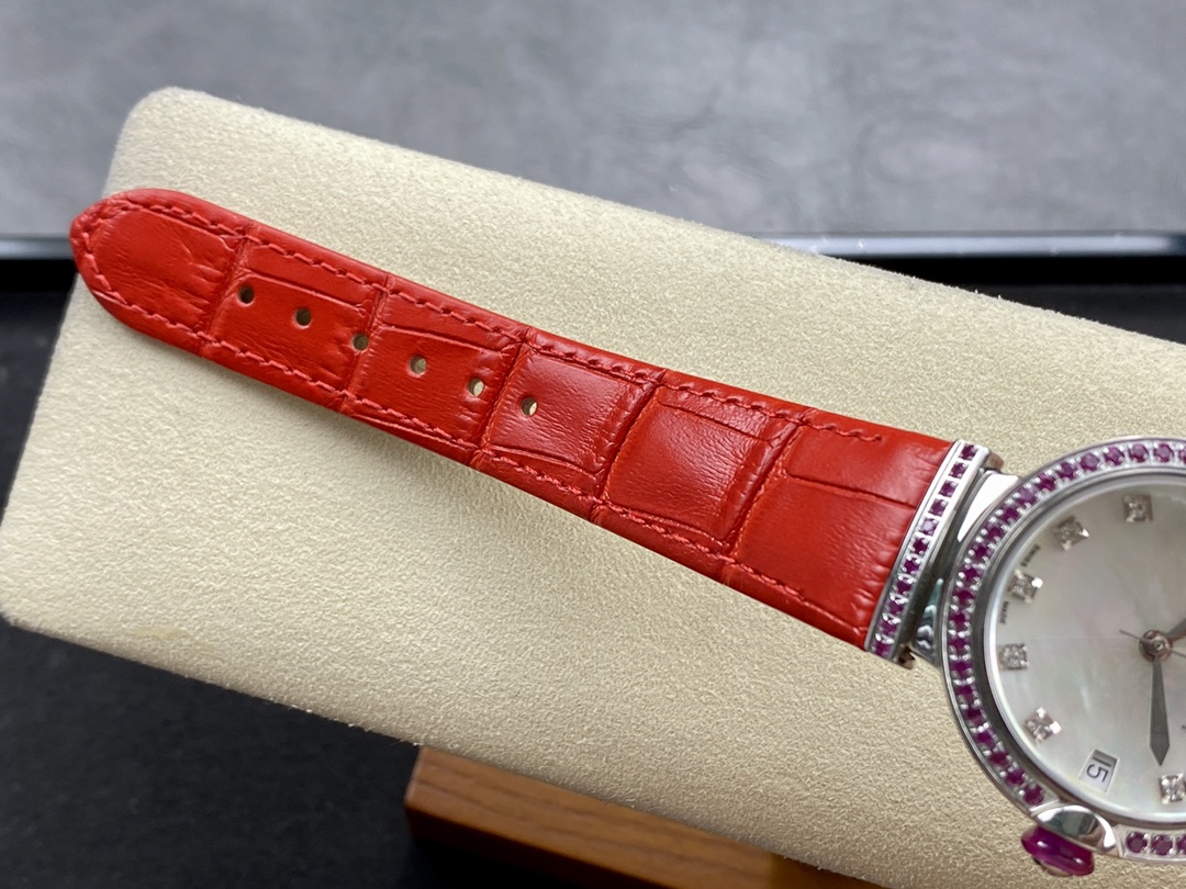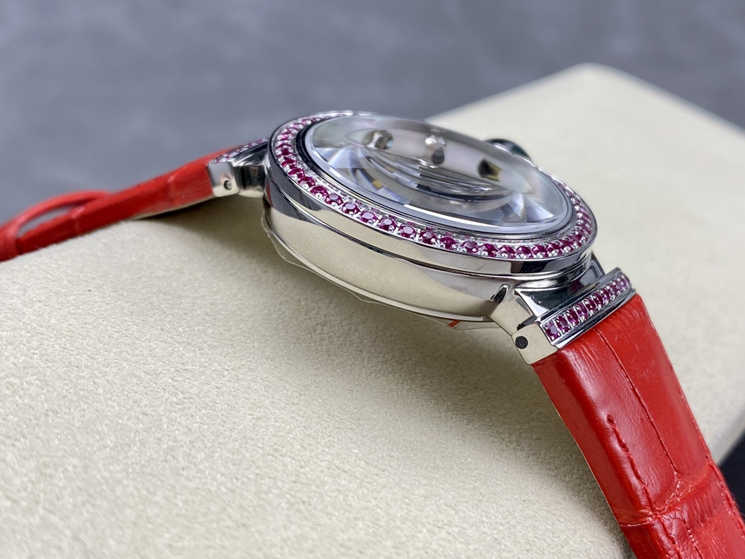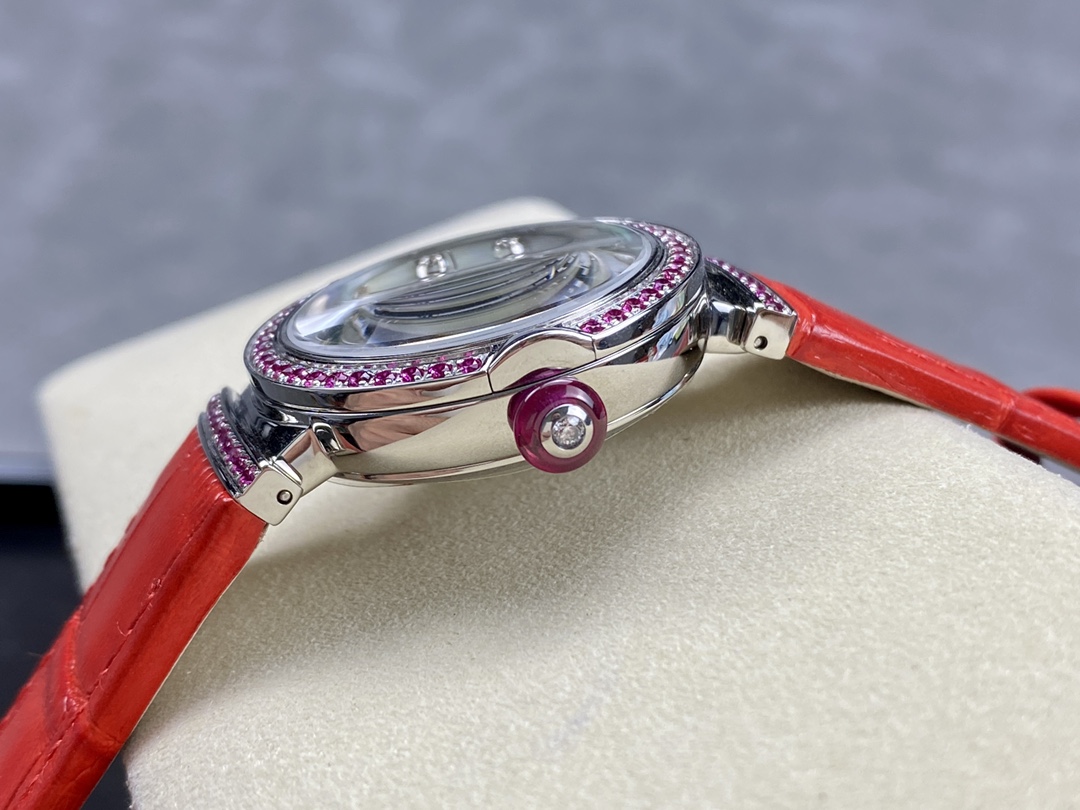 LVCEA watch with self-winding mechanical 2892 guilloché movement displaying hours, minutes and seconds, 33 mm diameter case set with 88 round brilliant diamonds, crown set with an oval-cut sapphire and a diamond, with a fine pin buckle